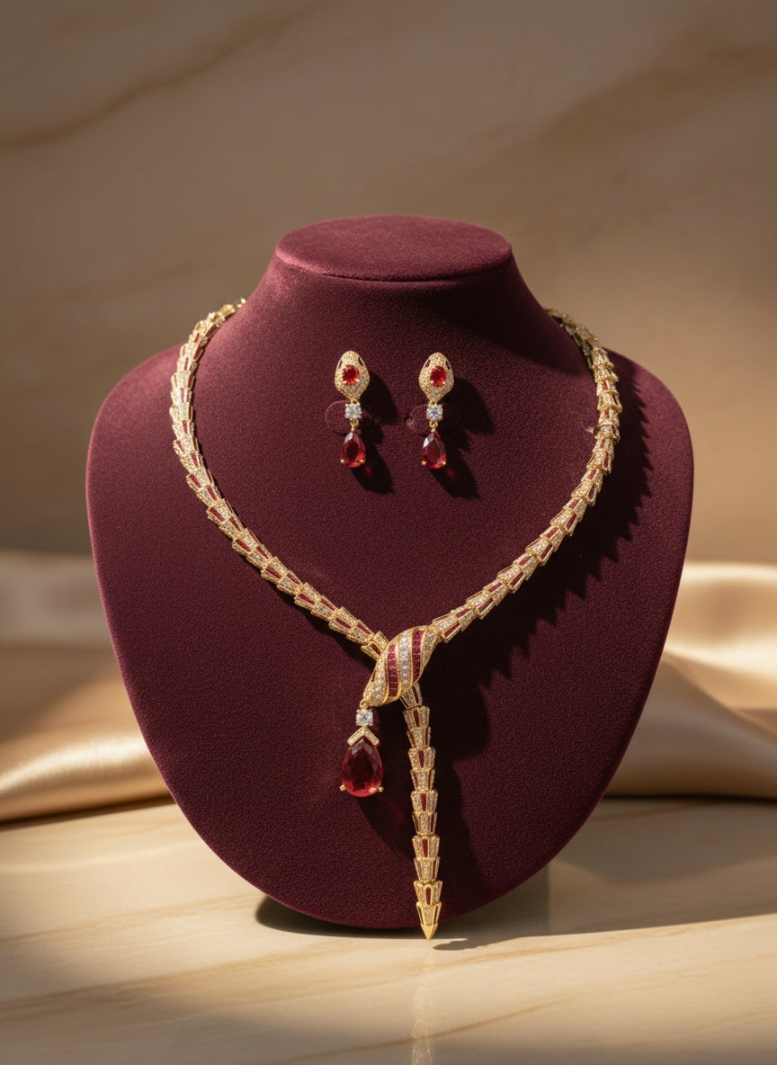 Dette luksuriøse smykkesettet kombinerer klassisk eleganse med en avantgarde unik look.
