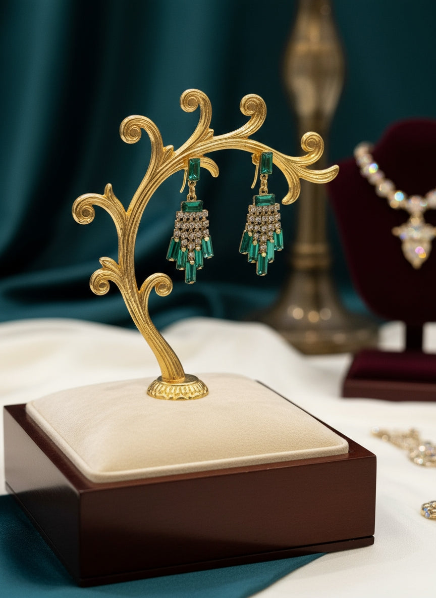 Elegante statement-øredobber i dyp smaragdgrønn tone, utsmykket med glitrende detaljer som skaper et luksuriøst og iøynefallende uttrykk. De raffinerte leddene gir smykket bevegelse og glans, og gjør det til et perfekt valg for spesielle anledninger.