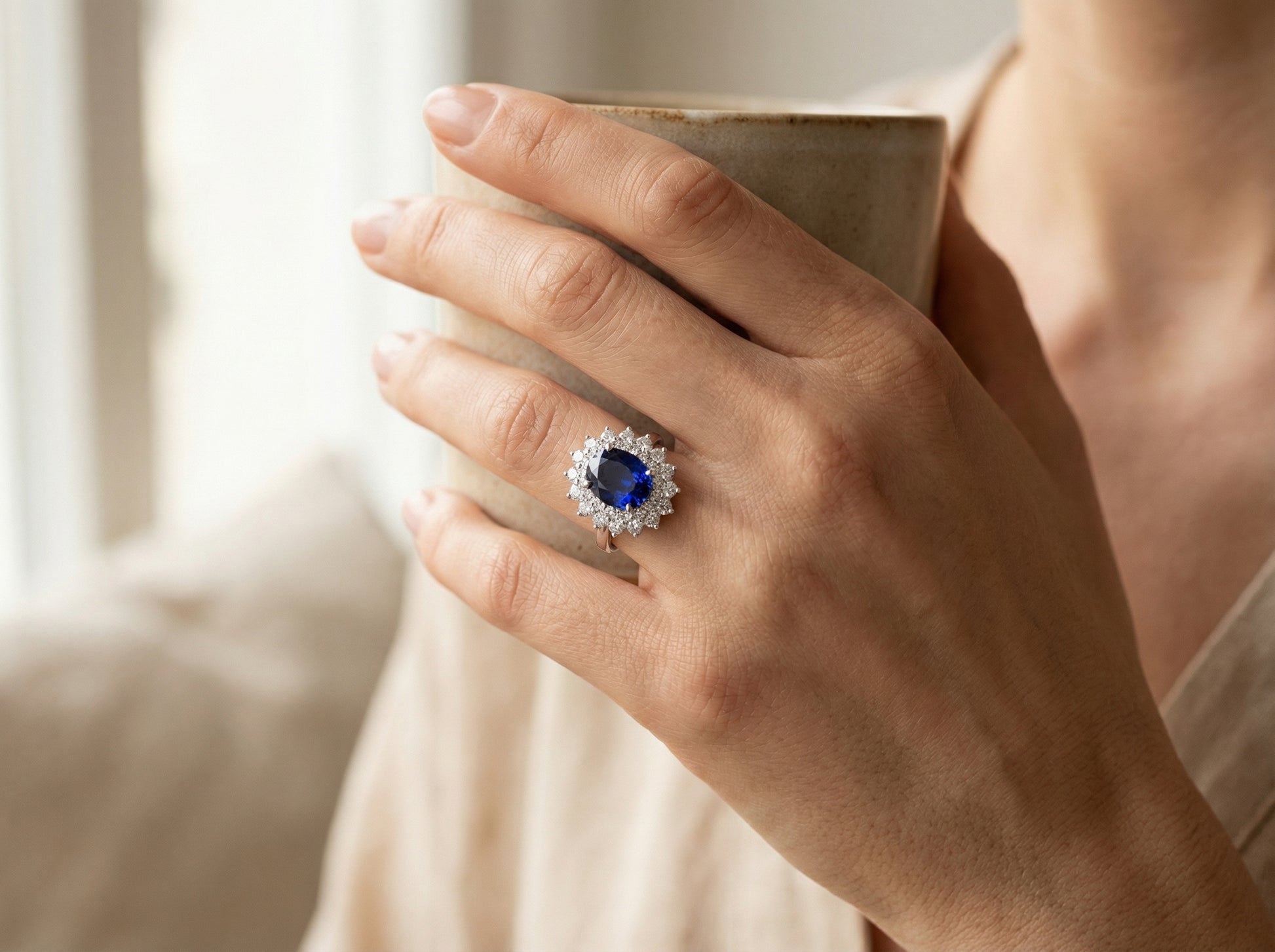 En ring som fanger oppmerksomheten umiddelbart – Midnight Sapphire Halo Ring kombinerer klassisk kongelig eleganse med moderne luksus. Den dype, safirblå midtstenen er briljantfasettert for maksimal glød, og omsluttet av en overdådig dobbel halo av klare cubic zirconia som gir et blendende lys-spill fra alle vinkler.