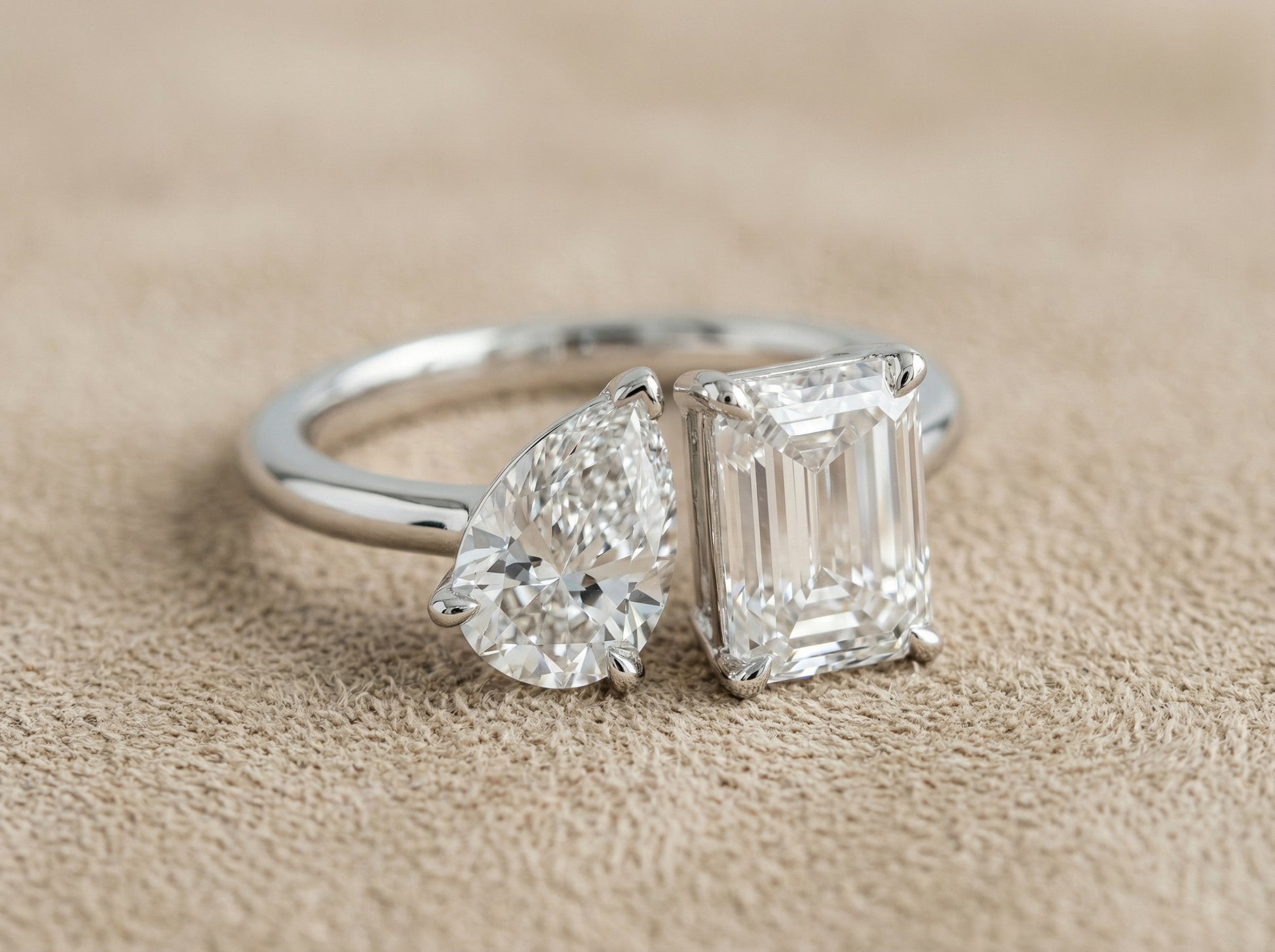 Two Stone Diamond Ring – Emerald / Pear Cut (Gull & Sølv)